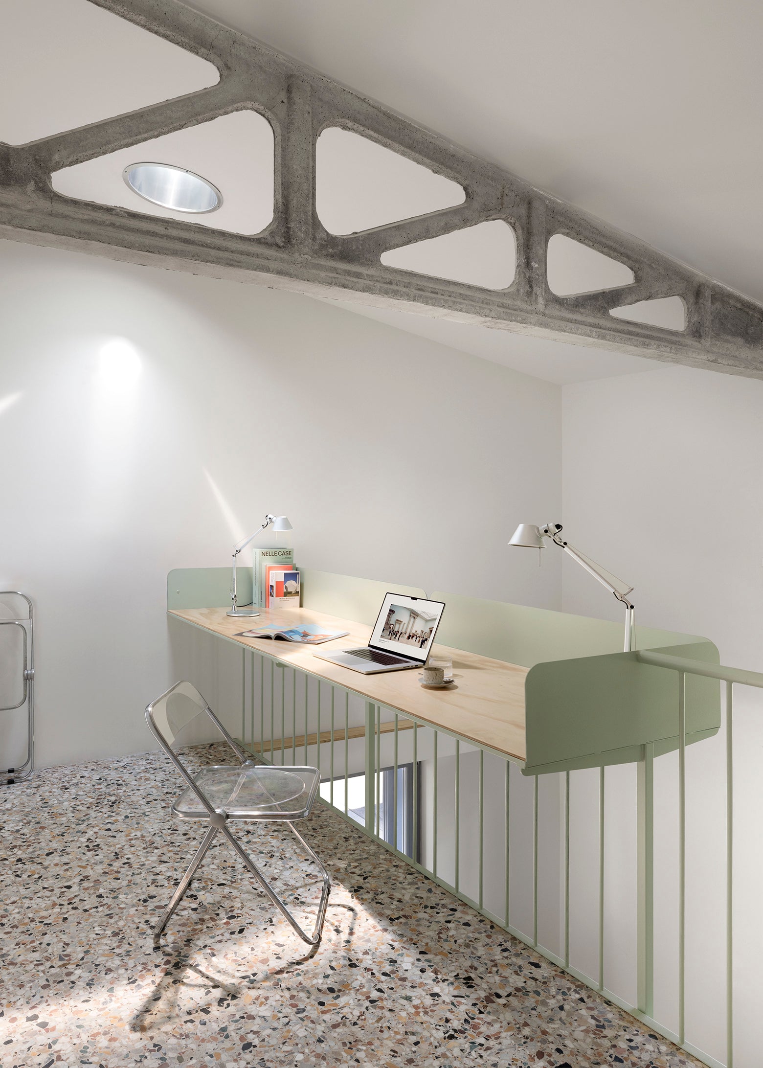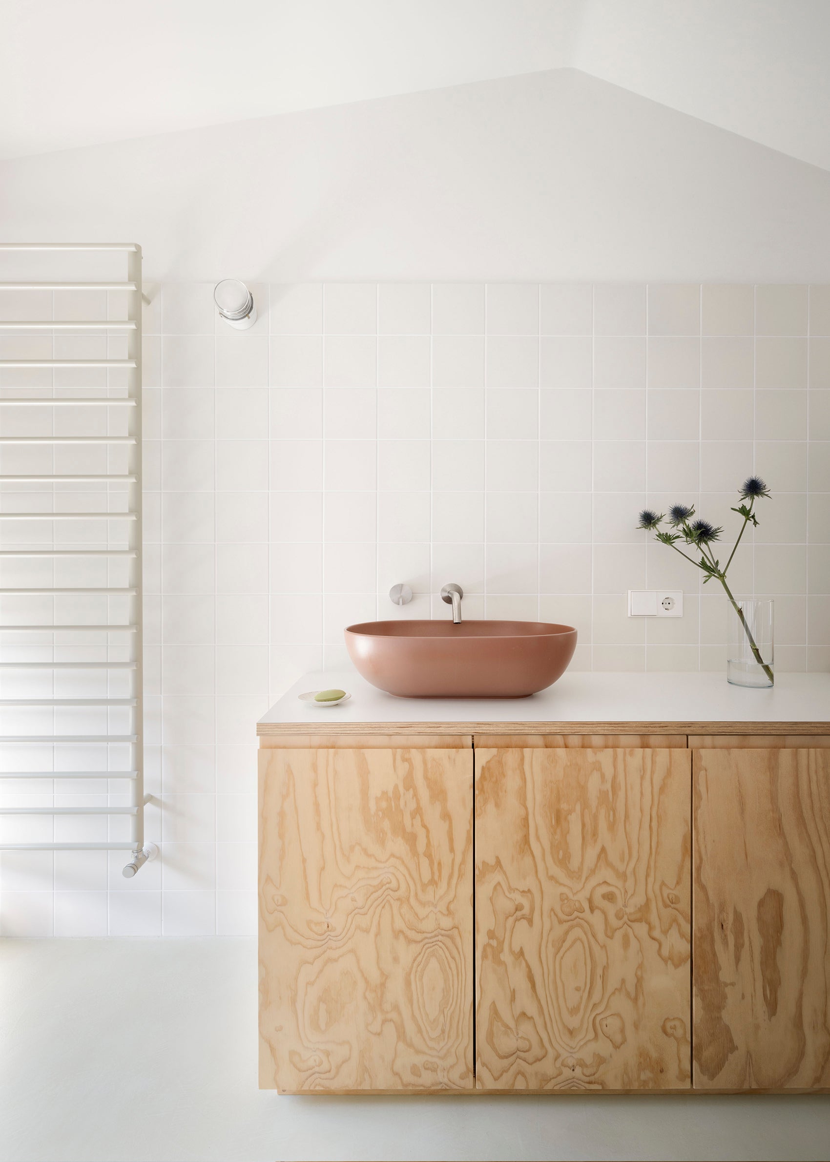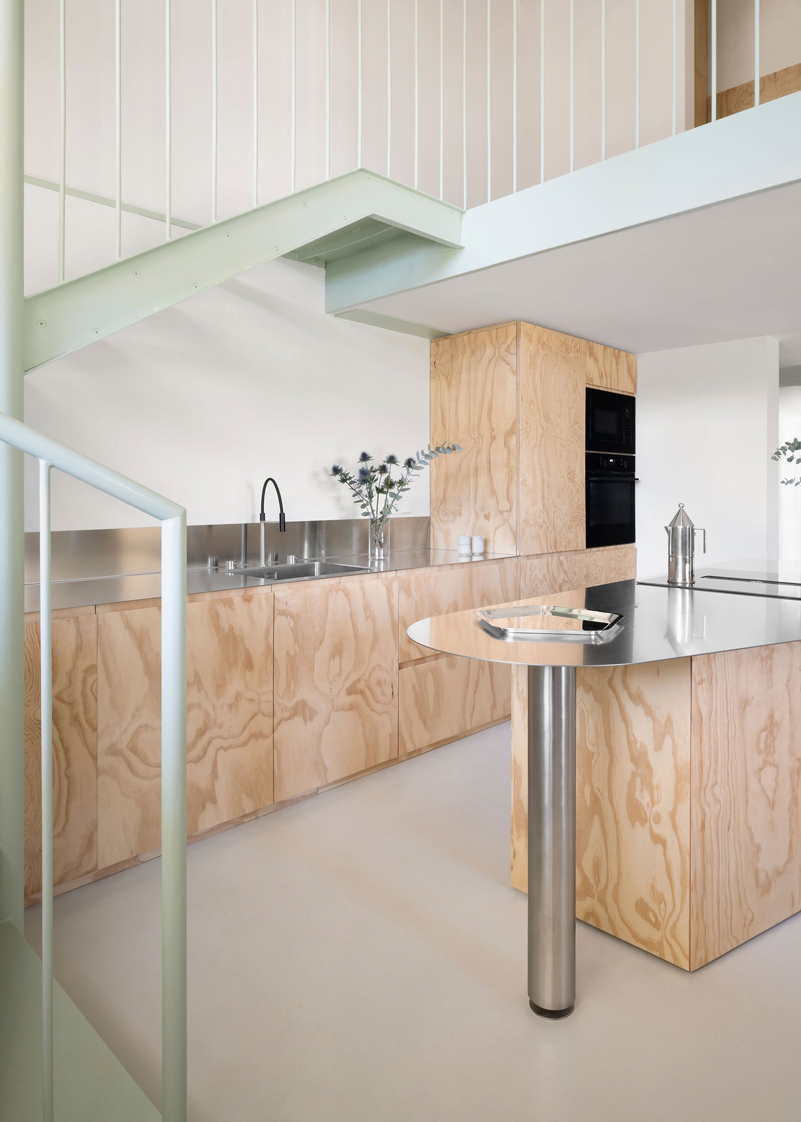 Progetto di arredo completo in compensato di pino cileno, top cucina in acciaio inox con vasca termosaldata, top bagni in compensato di betulla laminato formica.