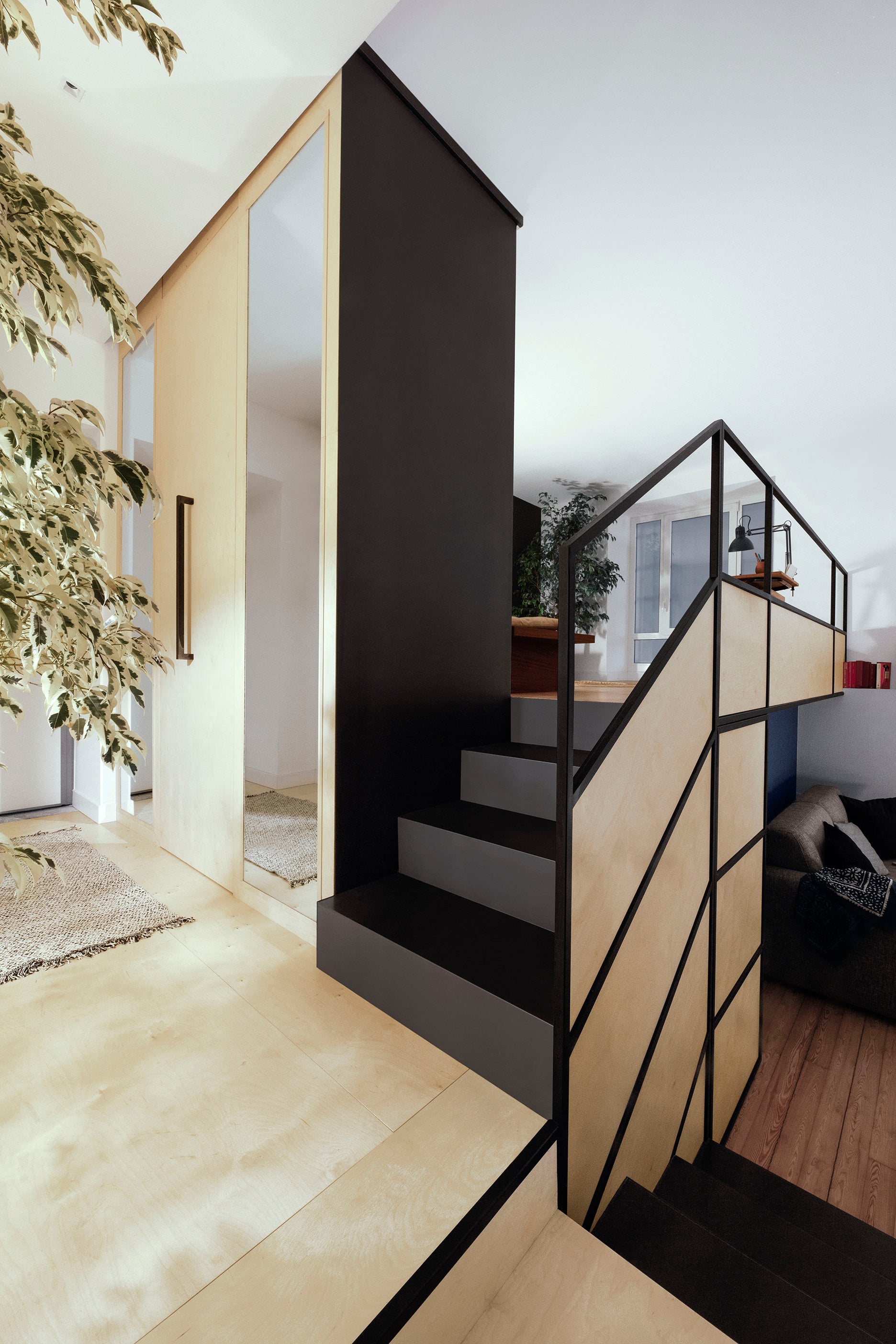 Struttura, parapetti e scale in ferro grezzo con finitura protettiva trasparente opaca.